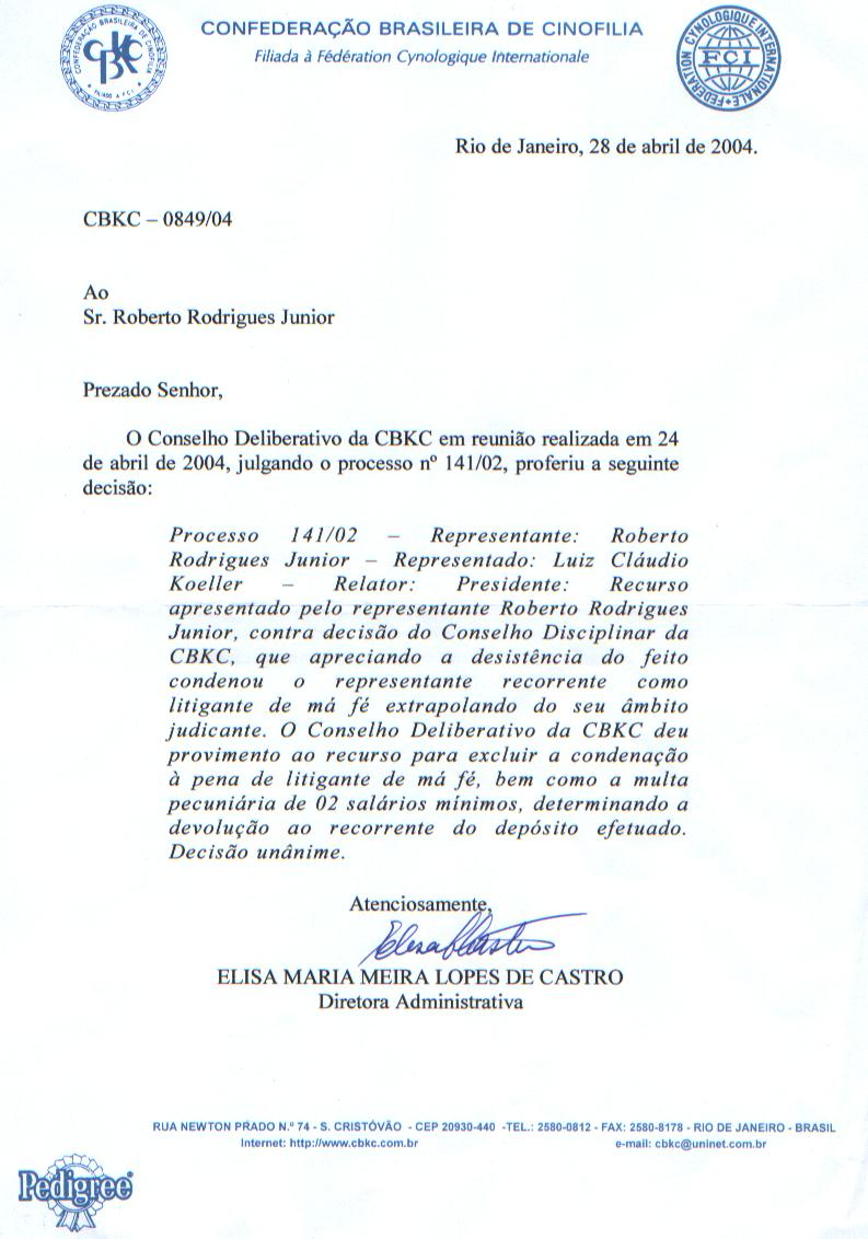 Ficamos muito satisfeitos com o ocorrido, uma vez que a verdade foi restabelecida de fato e direito, queremos agradecer aos Conselheiros e a Presidência da CBKC que souberam avaliar corretamente este assunto.