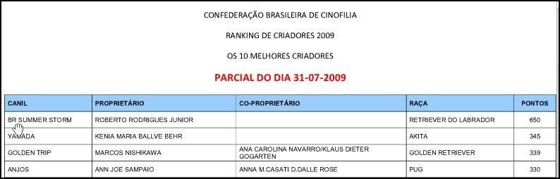 05/08/2009 - O Canil SUMMER STORM, novamente na segunda apuração do RANKING CBKC - 2009, está posicionado no 1º Lugar ENTRE todas as raças.Confira abaixo: