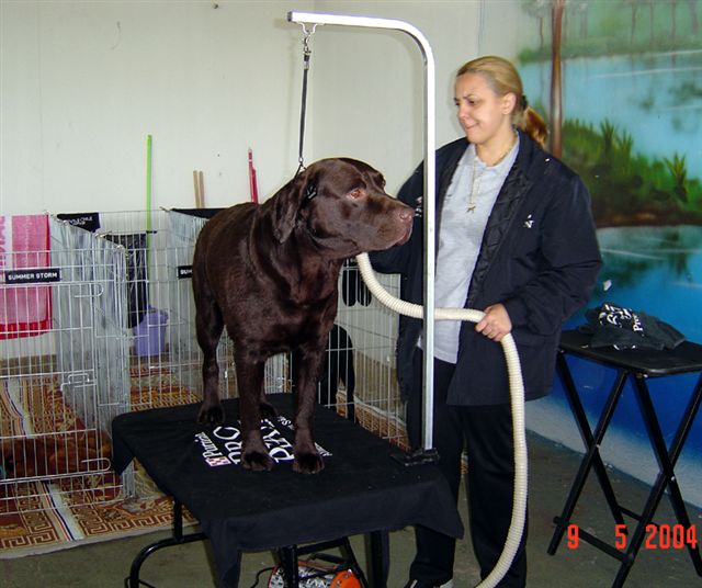 09/05/2004 - Quase nunca divulgamos imagens de nosso acampamento, até porque é muito dificil sobrar um tempinho para 'sacarmos" fotos de nós mesmos, porem recebi de nosso amigo "Belo", esta foto de Renata preparando "JJ" na exposição de Araras, faço neste artigo uma homenagem a Renata por seu incansavel trabalho com nossos cães.