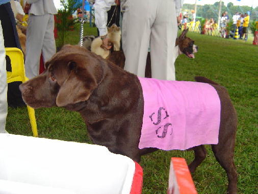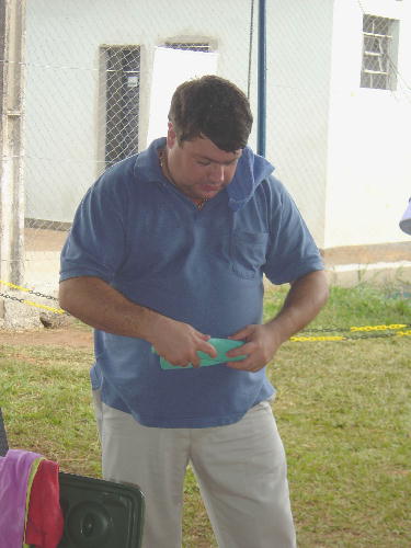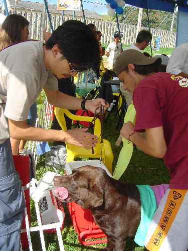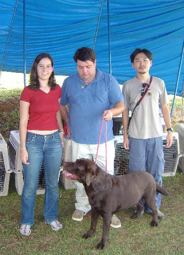 Na sexta, eu e Michel (o japa) ficamos mais assistindo do que qualquer outra coisa, sem saber nem por onde começar a ajudar. Descarrega todas as caixas, coloca no lugar, arma os cercados, solta os cachorros nos cercados para fazer xixi e esticar as pernas, liga os ventiladores (eram 6 ventiladores! A gente passando o maior calor, e os cães lá, tomando um ventinho...), coloca as esteiras no chão, monta as mesas, enfim... Dentro de uma ou duas horas, o acampamento estava pronto, todos os cachorros tinha comido e feito xixi, e estavam com água fresca nos baldinhos.