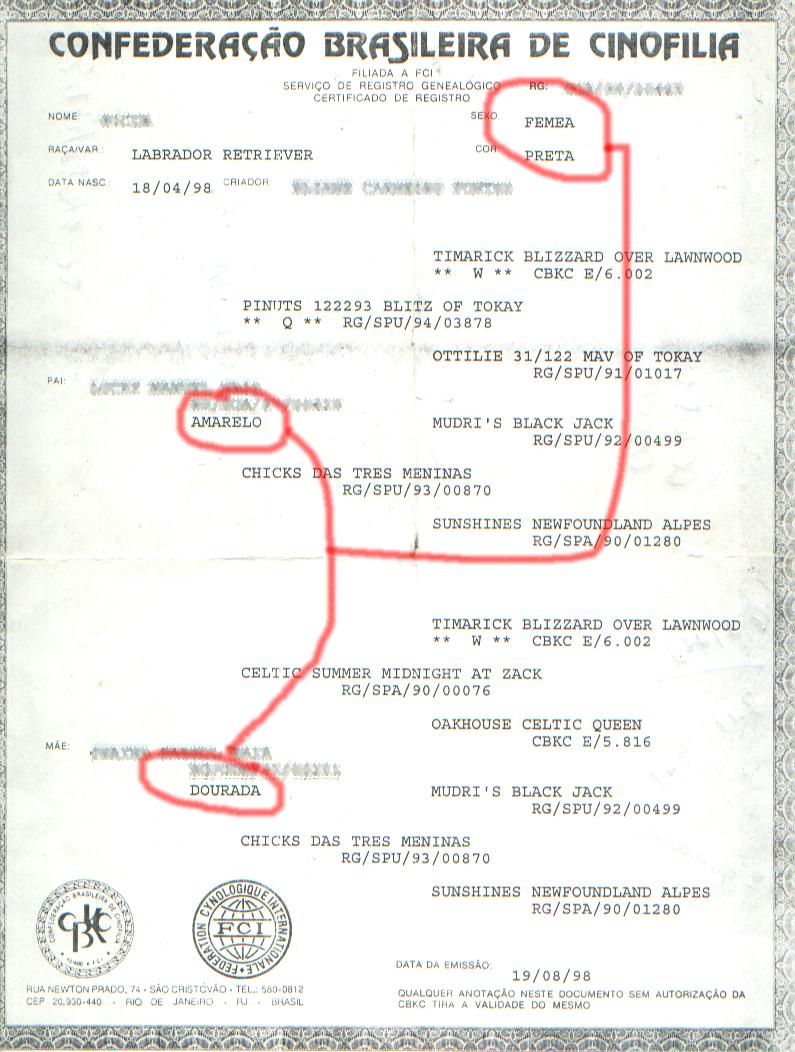 Vejam que absurdo, DOIS CÃES AMARELOS GERARAM segundo o PEDIGREE, um cão PRETO.