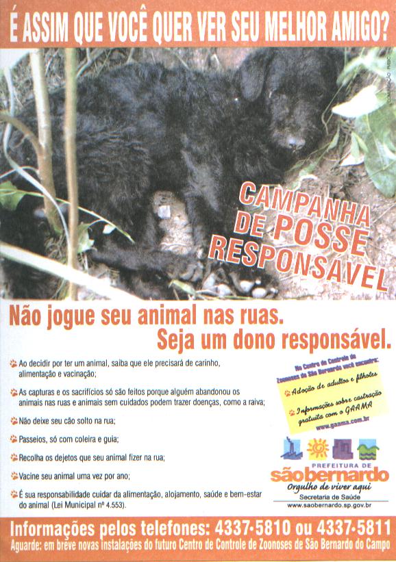 Em um exemplo de boa administração e respeito aos animais, a Prefeitura de S.B. do Campo tem sua campanha de posse responsavel.