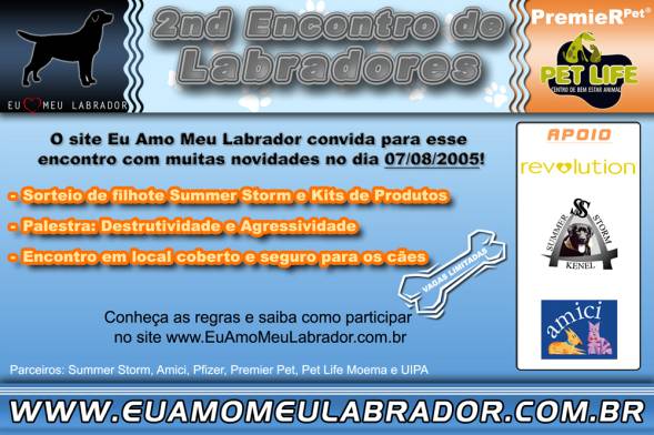 É com imenso prazer que convidamos todos nossos amigos, e verdadeiros amantes da raça LABRADOR, para o 2º encontro a se realizar em SP, o encontro é promovido pelo site www.euamomeulabrador.com.br , e tem o canil SUMMER STORM como parceiros nesta empreirada, vamos prestigiar..., compareça levando consigo 1 saco de ração, e concorra ao sorteio de um filhote lindo que está sendo doado por nosso canil.
