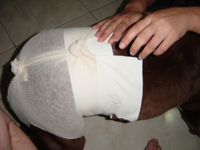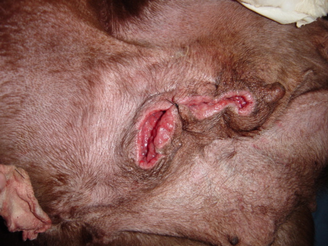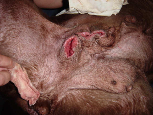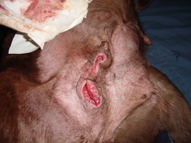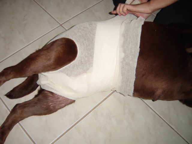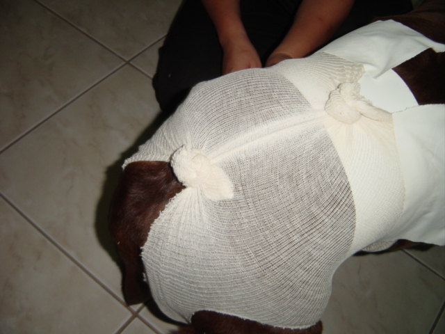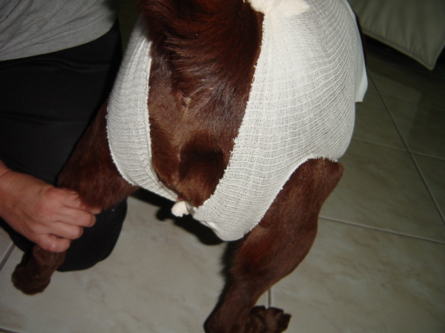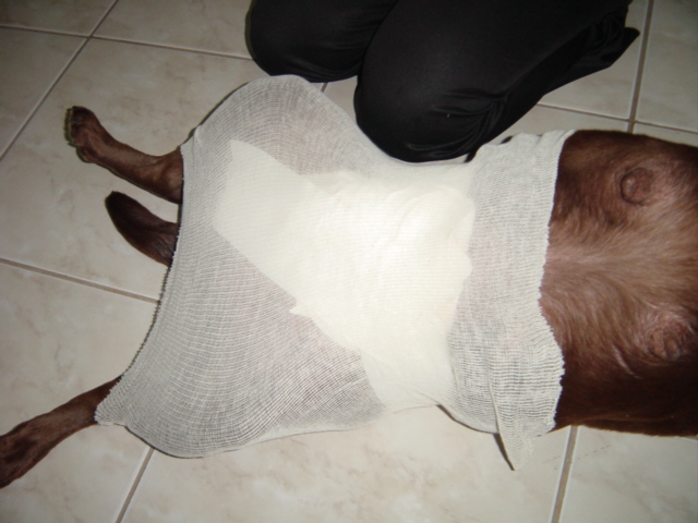 Passados alguns dias, o tecido necrosado foi retirado como visto nas primeiras fotos deixando um enorme buraco, uma das mamas teve que ser removida infelizmente, mas graças a competência de nossos Veterinarios o processo de cicatrização já começou e vai bem como pode ser visto nas fotos abaixo, o inconveniente e que a lesão não pode ser fechada por enquanto devendo permanecer aberta, por isso poucos pontos, na semana proxima vai se avaliar se o corte pode ser suturado. Nas fotos eu e a Renata fazemos o curativo diario dela.