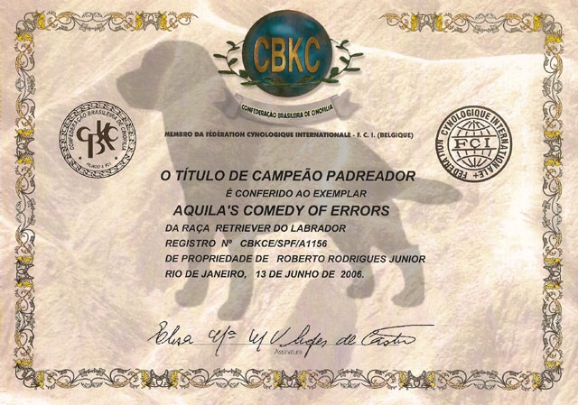 JJ, o lab # 1 do Brasil de todos os tempos, tambem é agora CAMPEÃO PADREADOR, veja abaixo o titulo emitido neste mês pela CBKC