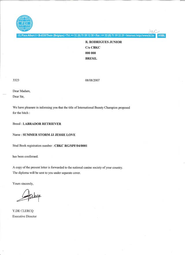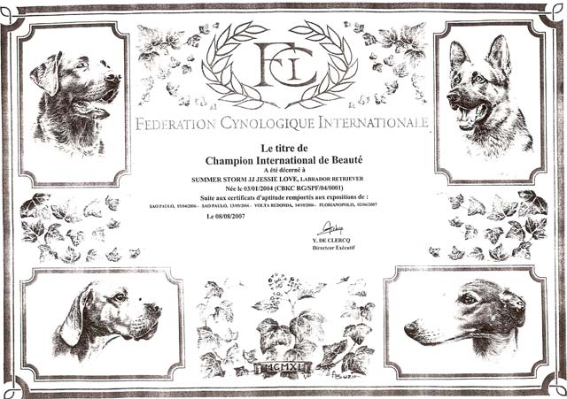 04/10/2007 - Recebemos da FCI o diploma da SUMMER STORM JJ JESSIE LOVE, que passa a integrar um seleto grupo de cães da raça Labrador com esse titulo no Brasil e porque não citar no mundo todo, para quem não acompanha exposições para ser INTERNATIONAL CHAMPION, é preciso ganhar melhor do sexo, em 4 exposições diferentes com 4 juizes diferentes, todos de PAISES DIFERENTES, sendo que o 1º CACIB (certificado outorgado em cada vitoria) ao ultimo deve existir um intervalo de 1 ano.