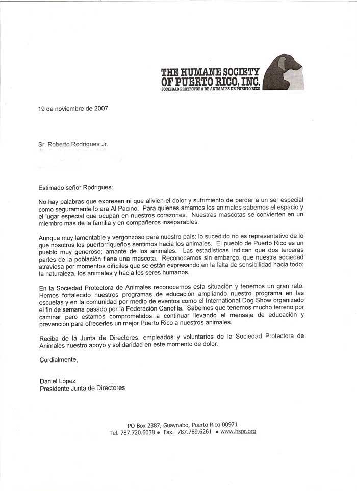 23/11/2007 - Segue abaixo cópia da carta que recebemos da The Humane Society of Puerto Rico.