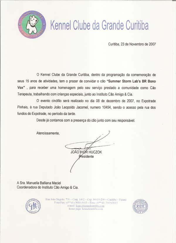 27/11/2007 - BONO - Summer Storm Lab's Br JJ Bono Vox, filho de JJ e ULLY, vai ser homenageado em 08 de Dezembro de 2007, por serviços prestados como CÃO TERAPEUTA, esta noticia muito nos orgulha... por sermos os criadores deste lab especial, com um temperamento tipico da raça.
